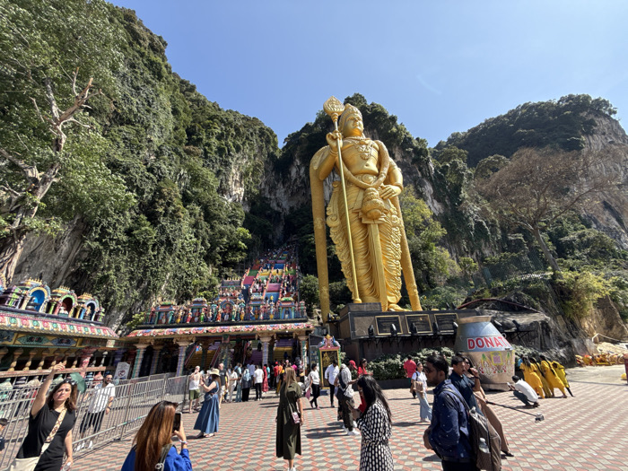 A towering golden statue of a deity stands prominently. Colorful steps ascend to a cave entrance flanked by lush greenery. People gather at the base, some taking photos. A donation container is visible near the statue. The scene is set against a clear blue sky, highlighting the intricate details of the religious site.