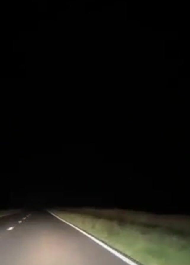 view from inside a car driving on a dark road at night. The car's headlights illuminate the road ahead, showing the road markings and some vegetation on the sides. The surrounding area is completely dark.