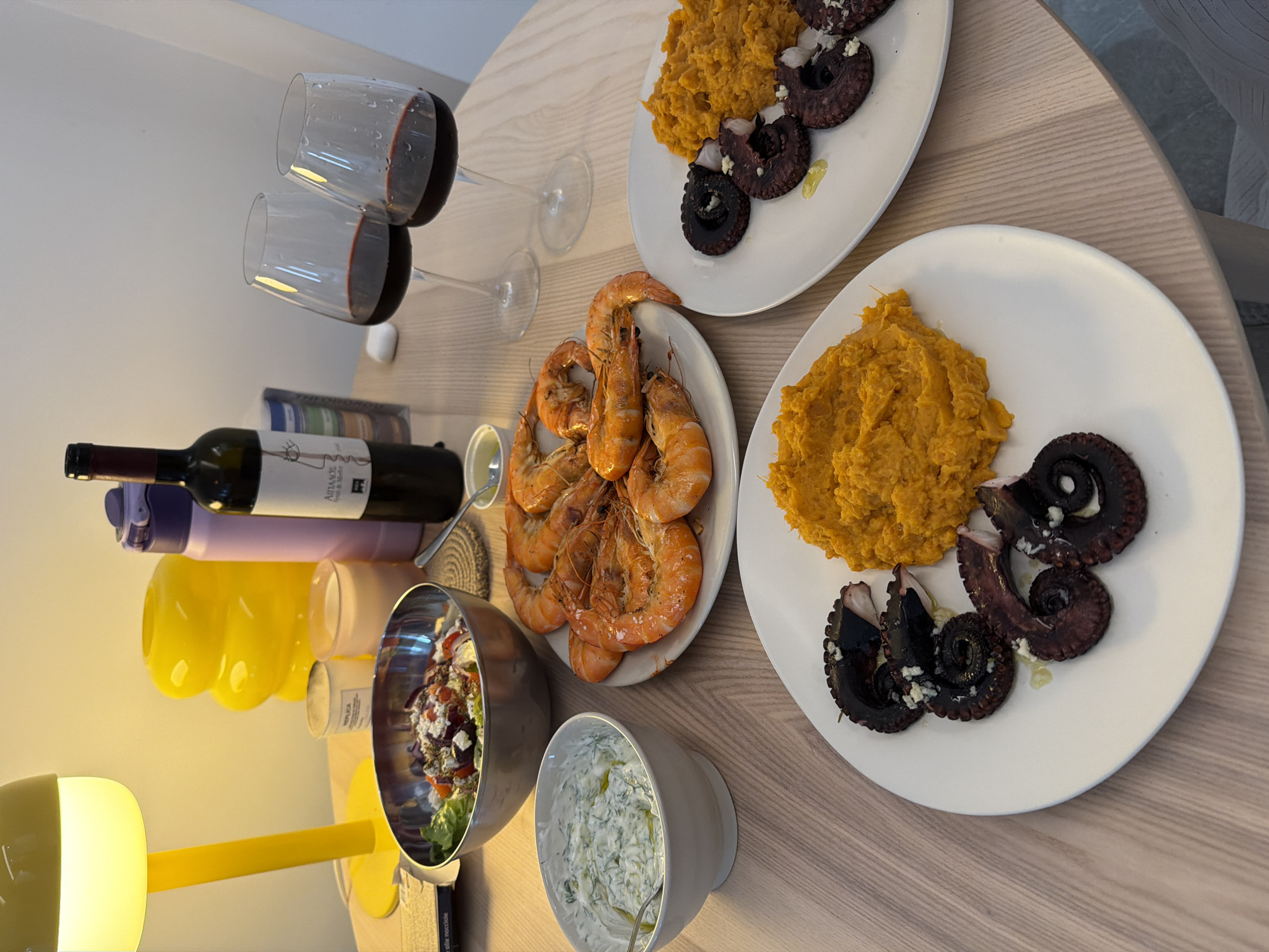 On a light wooden round table, two plates each contain a portion of mashed orange-colored food and several pieces of dark, cooked octopus. Adjacent to these are a plate of cooked shrimp, a bowl of salad, and a bowl of white sauce. Nearby, there are two glasses filled with red wine, a wine bottle, a yellow water bottle, and a lamp with a yellow light source. The scene seems to be indoors, potentially in a dining area in Livadia Larnakas, Cyprus. There are no visible people in the image.