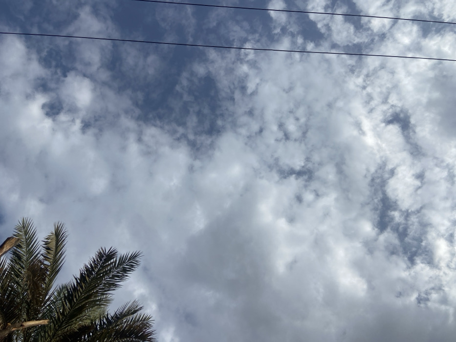 A wide-angle shot captures a sky filled with a mix of blue patches and white clouds, partially obscured by wisps of cirrus. Two dark electrical wires stretch horizontally across the top. In the lower left corner, the fronds of a palm tree frame the scene, their silhouettes adding depth and texture. The composition balances the expansive sky with the terrestrial element of the tree.