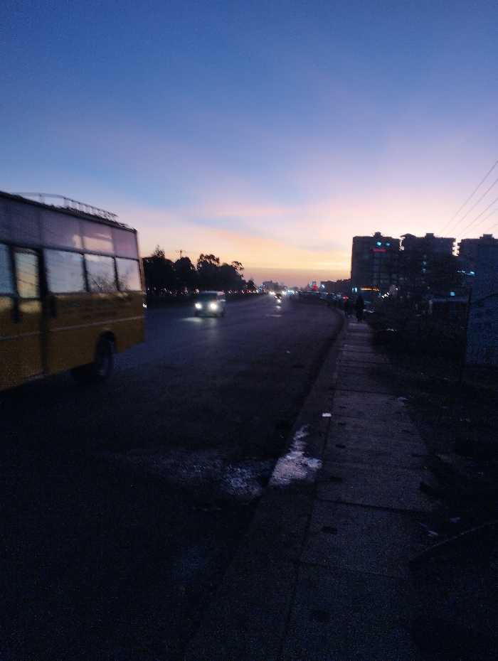 A low-angle shot captures a street at dusk. A yellow bus occupies the left frame, while cars with headlights illuminate the road. Buildings stand to the right, beneath a colorful sky transitioning from blue to orange near the horizon. A sidewalk runs along the right side, with dark pavement in the foreground. Utility lines are visible overhead.