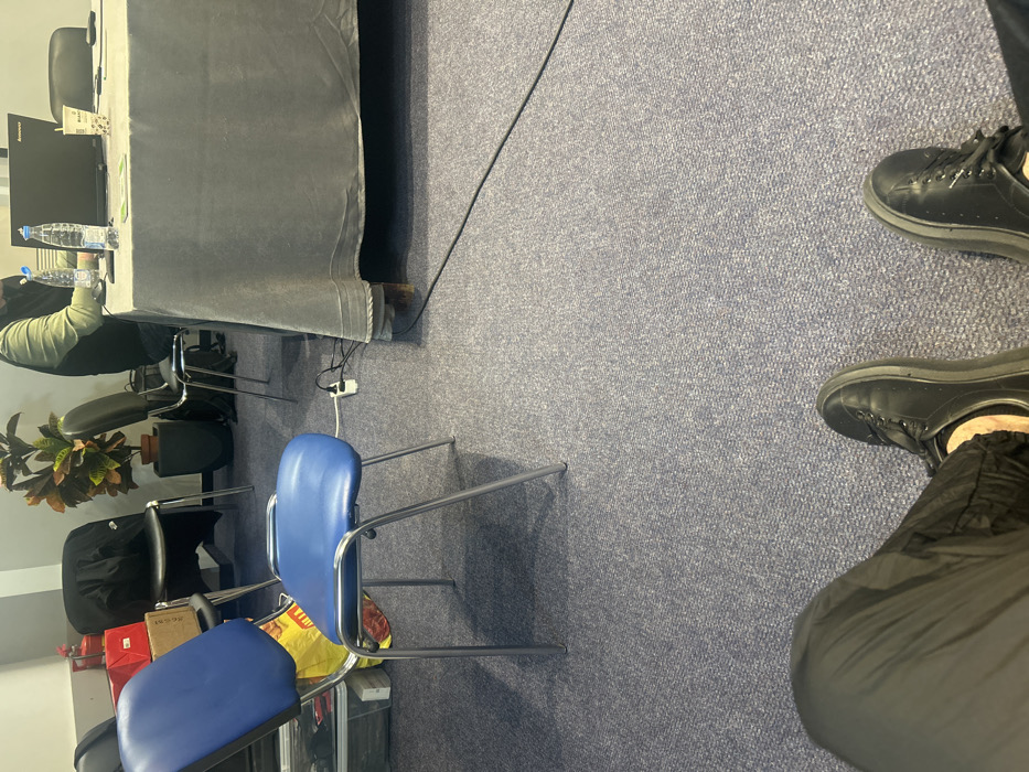 The image captures an indoor scene in Sofia, Bulgaria, from a low, first-person seated perspective. The foreground features a person's legs, clad in black trousers and black athletic shoes, resting on a blue-grey speckled carpet that covers the entire floor. In the midground, a blue upholstered chair with chrome-plated legs is positioned on the left. Behind this chair, a yellow plastic bag is visible next to stacked red cardboard boxes. Further back on the left, a red fire extinguisher is partially obscured. To the right of the blue chair, a long table covered with a grey tablecloth extends across the frame. One wooden table leg is visible beneath the tablecloth on the right. A person is seated at the far side of the table, viewed from the back, wearing a dark vest over a lighter long-sleeved shirt, actively using a black Lenovo laptop. On the table in front of this individual are two plastic water bottles with blue caps, a white coffee cup branded "BIANCHI," and several green documents or cards. A white power strip is situated on the carpet near the table's base, with a black cable extending from it towards the foreground. In the background, a large potted plant with green and reddish-brown foliage sits in a dark planter. Additional black chairs with chrome legs are scattered: one behind the blue chair with a black jacket draped over it, and another behind the person at the table. The room's walls are light-colored. The environment suggests an active conference, meeting, or workspace.