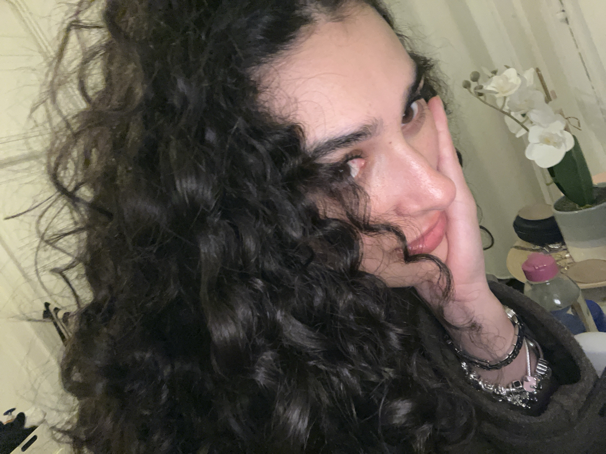 - "A close-up portrait of a person with dark, curly hair holding their hand to their face" by FM-Qsqlb2, licensed under CC BY 4.0