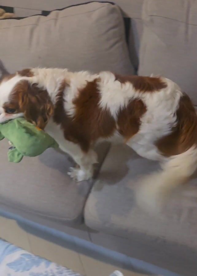 Cavalier King Charles Spaniel dog, mostly white with brown markings, standing on a gray sofa. The dog is holding a green plush toy in its mouth. The toy appears to be an alligator or crocodile. The dog adjusts its grip on the toy and turns slightly, seemingly showing off the toy to the camera. The sofa has several cushions and a throw blanket visible in the background. The floor is tiled.