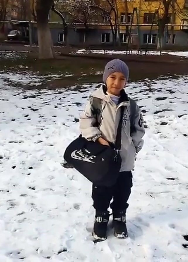 A young person stands in a snowy, urban park. The individual is wearing a light-colored jacket, dark pants, and boots, with a grey knit hat. They carry a black Nike bag over their shoulder. The ground is a mix of snow and bare earth. In the background, there is a multi-story apartment building with many windows and a few cars parked nearby. Trees with bare branches are scattered throughout the scene. The lighting is somewhat muted, suggesting an overcast day.