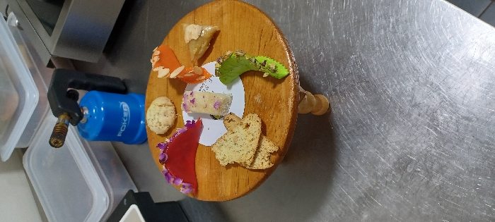 A variety of colorful, bite-sized pastries are displayed on a small wooden cake stand with a handle. The pastries include baklava, biscotti, and other unidentified sweets, some adorned with rose petals and almond slivers. To the side is a blue butane torch. The scene appears to be a close-up shot on a stainless steel counter in a kitchen setting.