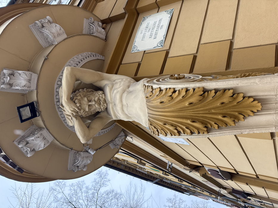 - "An upward-angle view captures a light-colored, muscular male statue, depicting an Atlas or Caryatid, supporting a curved architectural soffit on a building corner at Republic Square (Trg Republike / Köztársaság tér) in Subotica, Serbia" by FM-fSbZr2, licensed under CC BY 4.0