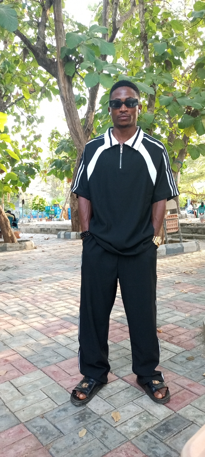An adult male stands centrally in an outdoor, paved area within Adankolo, Nigeria. He wears black sunglasses, a black short-sleeved polo shirt with a white collar, white shoulder panels, and white sleeve stripes, black track pants with white side stripes, and black open-toe slide sandals adorned with gold-colored emblems. A dark beaded bracelet is on his left wrist, and a gold-colored watch is on his right. Small silver-colored earrings are visible. He stands with hands in pockets, facing the camera directly. Behind him, multiple trees with light brown trunks and large green leaves are present. The ground is paved with interlocking concrete blocks in alternating patterns of light grey and reddish-brown, with a few dry leaves scattered. In the background, a low concrete structure is visible to the left, and further back, steps, blue and yellow plastic crates, and indistinct figures of other individuals are discernible, indicating a public or communal space.