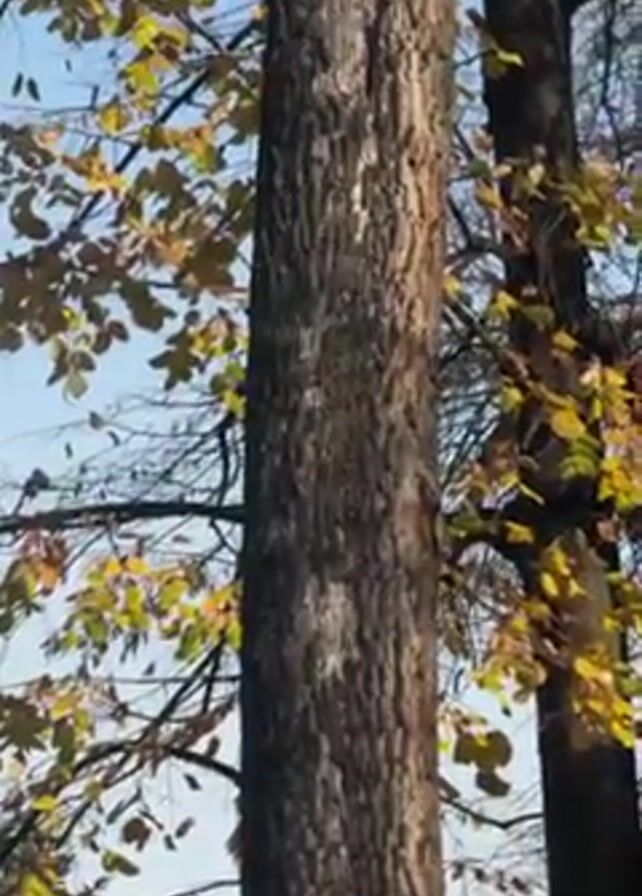 The camera pans up a large tree trunk with textured bark, revealing some yellowing leaves still on the branches, then bare branches against a blue sky
