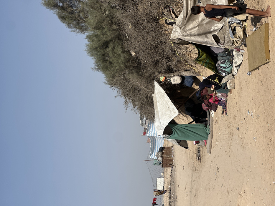 The image displays an outdoor encampment on sandy, light-brown ground under a clear, pale blue sky in Nuseirat, Palestinian Territory. On the right side of the frame, a dense, scrubby embankment with a mixture of dry and green foliage rises. Two primary makeshift shelters dominate the mid-ground, constructed from tarpaulins and fabrics. The left shelter features a light-colored tarp draped over a structure, from which a green blanket or fabric hangs as a partition. Immediately adjacent to it on the right is another shelter, formed by an off-white tarp. Near these shelters, an adult female, wearing dark clothing and a head covering, is seated directly on the sand, holding a yellow object in her hands. Beside her, a young child, dressed in a pink garment, is also seated on the ground, engaged with an object in her hands. Several bags, including a blue duffel bag and other fabric items, are visible on the ground around the seated individuals and hanging from the shelter structures. In the foreground, to the far right, a young boy in a dark tank top and shorts stands facing away from the viewer. Further to the left, in the background, a dark mesh fence runs horizontally, separating the foreground from additional rudimentary structures. One of these structures utilizes a blue and white striped tarp. Clothes are suspended on a line behind this fence, and a dark metal container is also visible. The sandy ground throughout the scene is uneven and scattered with small pieces of debris and detritus.