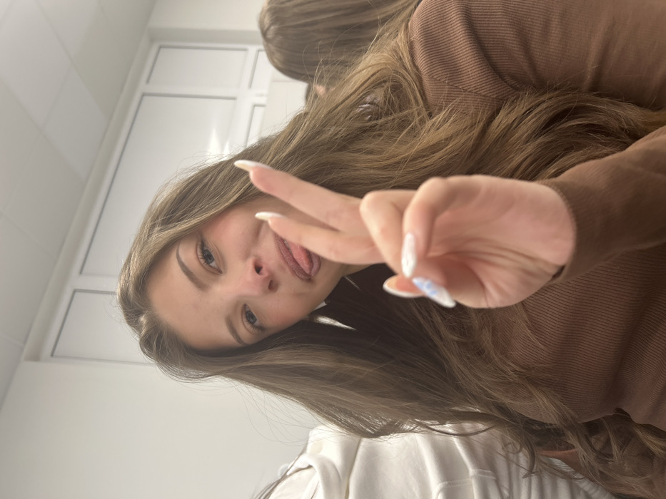 An indoor scene depicts a young female positioned centrally, facing the viewer directly. She has long, wavy, light brown hair and fair skin with visible blush on her cheeks. Her tongue is slightly extended, and her right hand is raised, forming a "peace" sign with extended index and middle fingers. Her fingernails are long, almond-shaped, and painted white with light blue or purple abstract designs. She is wearing a brown, long-sleeved, ribbed top and white, possibly oval-shaped, earrings. A portion of another individual wearing a white hooded garment is visible to the immediate left. To the right, out of focus, the head and shoulder of a third person with long brown hair are visible. The background consists of a plain white wall with visible horizontal and vertical seams, indicating paneling or modular construction. The lighting is bright and even. The exact location in the city of Pernik, Bulgaria, is not discernible from the visual information provided; however, the setting is definitively indoors.