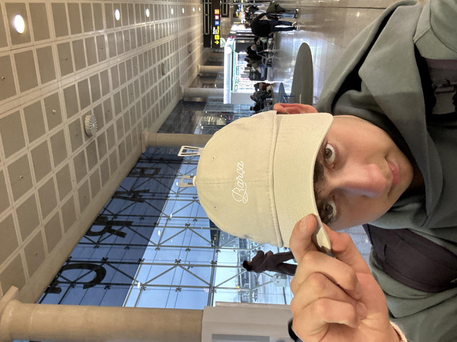 The image captures an indoor scene within the Josep Tarradellas Barcelona-El Prat Airport in El Prat de Llobregat, Spain. In the foreground, a young male, approximately late teens to early twenties, is depicted in a selfie-style shot, looking directly at the camera. He wears a light beige baseball cap with "Barça" embroidered in white cursive script on the front, and his right hand is seen adjusting the brim. He is also wearing a grey-green hooded sweatshirt, with a black backpack strap visible over his right shoulder. The background reveals a spacious airport terminal. The ceiling features a grid of square panels with integrated recessed lighting and circular ventilation grilles. Large, light-colored structural columns are visible throughout the concourse. A prominent feature is a vast glass curtain wall that forms the exterior boundary of the terminal. Through this window, an airfield or tarmac area is visible under an overcast sky. Large, inverted lettering spelling "BARCA" is reflected on the interior surface of the glass. In the mid-ground, several other individuals are present; some are seated on benches in a waiting area, while others are walking, one of whom appears to be pushing luggage. Distant retail kiosks or shops are visible along the right side of the concourse, beneath overhead directional signage displaying black text on yellow and white panels, indicating gate information such as "UWY." The flooring is a polished, reflective surface.