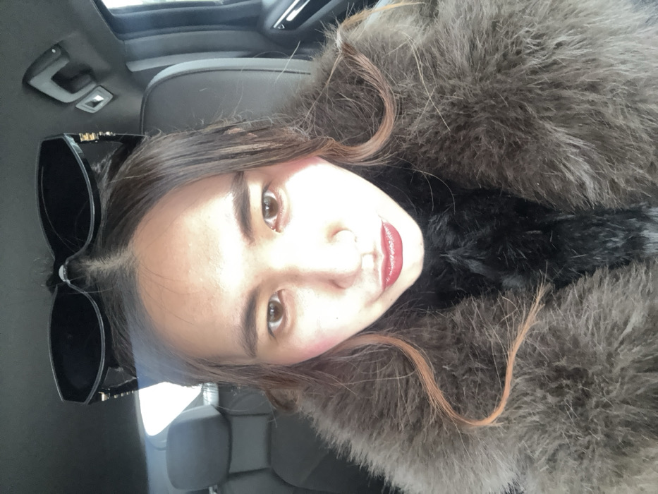 A person, likely female, is featured in a selfie-style photograph, wearing a fur coat. A pair of large, black sunglasses are perched on their head. The person has brown hair, brown eyes, and is wearing lipstick. They are seated in a car. The lighting is bright, possibly from a sunroof. The image appears to be rotated slightly.