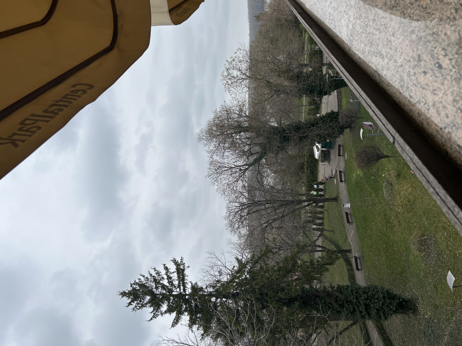 An elevated outdoor scene captured under an overcast sky depicts a section of the Danube River Park in Silistra, Bulgaria. In the immediate foreground, a dark-edged, granite-textured balcony railing runs along the bottom and right side of the frame. Partially visible at the top right is a yellow or tan awning, displaying mirrored dark text that reads "Centrum Park." The midground features a public park with varied vegetation and infrastructure. A tall, dark green coniferous tree stands prominently on the left. Numerous deciduous trees, mostly bare, are scattered throughout the park, with some larger specimens heavily covered in ivy. Green grass covers the ground, interspersed with winding, dark-colored paved paths. Approximately six brown park benches are positioned alongside these paths. In the central-right area of the park, a small, white-covered kiosk-like structure with a green base is visible. Several indistinct human figures are present near this structure and along the paths; some appear to wear green outerwear, but specific actions or interactions are not discernible. The background reveals a wide, calm body of water, identifiable as the Danube River, stretching horizontally across the scene. The far bank of the river is lined with bare trees. The sky is uniformly gray and overcast, with no direct sunlight visible.