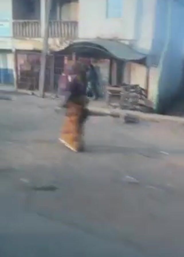 The video is taken from a moving vehicle driving through a somewhat rundown commercial area