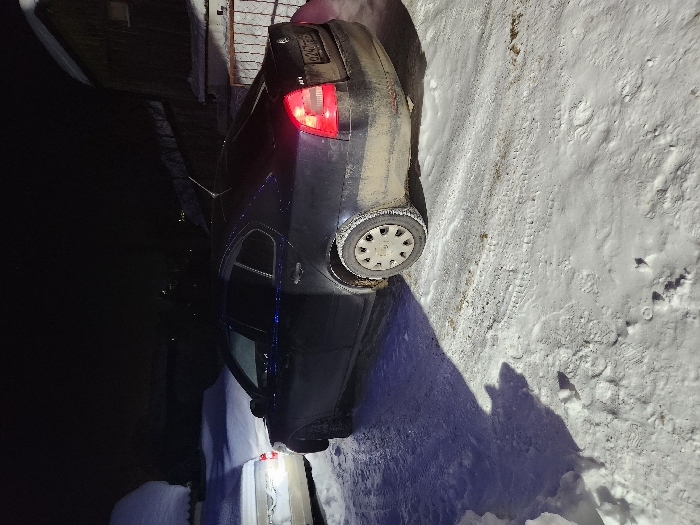 The image depicts a nighttime outdoor scene in Chaikovsky, Russia, characterized by extensive snow cover and artificial illumination. In the foreground, a dark-colored (likely black or dark blue) Skoda Octavia sedan is parked, angled slightly away from the viewer. Its rear taillights are illuminated red. The vehicle's lower body panels are visibly soiled with dirt and slush. The rear license plate, partially obscured by snow and dirt, displays "O247PA 59RUS." The wheels are equipped with hubcaps and show accumulations of snow and ice. To the far left, partially visible behind the primary vehicle, is a light-colored (possibly silver or white) vehicle, also covered in snow, with a single illuminated white light visible at its rear. The ground is covered in packed snow and ice, displaying distinct tire tracks and multiple footprints. A long, dark shadow cast by the primary vehicle extends across the snow-covered surface to the left. In the background to the right, a dark wooden building with a snow-covered roof is partially visible, along with a section of a fence. The sky is dark, indicating nighttime conditions. The "59RUS" on the license plate confirms the vehicle's registration in Perm Krai, Russia, which includes Chaikovsky.
