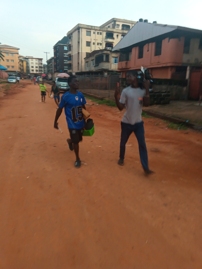 The image presents an urban street scene in Onitsha, Nigeria, featuring a wide, unpaved reddish-brown dirt road under an overcast sky. In the foreground, two young males are in motion. The male on the left is running, wearing a blue short-sleeved jersey with "NFL" and the number "15" on it, dark shorts, and dark footwear. He carries a light-brown rectangular object in his right hand and a green plastic crate in his left. The male on the right is walking, wearing a light grey t-shirt and dark blue trousers. He carries multiple dark-colored items, possibly footwear, draped over his left shoulder, and his right hand is raised, holding a red object or making a gesture. Further down the road, additional blurred figures, including one in a bright green shirt, are visible walking away from the camera. Vehicles are partially visible on the left side of the road in the distance. The background features several multi-story buildings: on the right, a two-story structure with a distinctive dark, angled roof and reddish-orange walls stands behind a low wall and a fence; on the left, multiple cream-colored or light-toned residential and commercial buildings line the street.