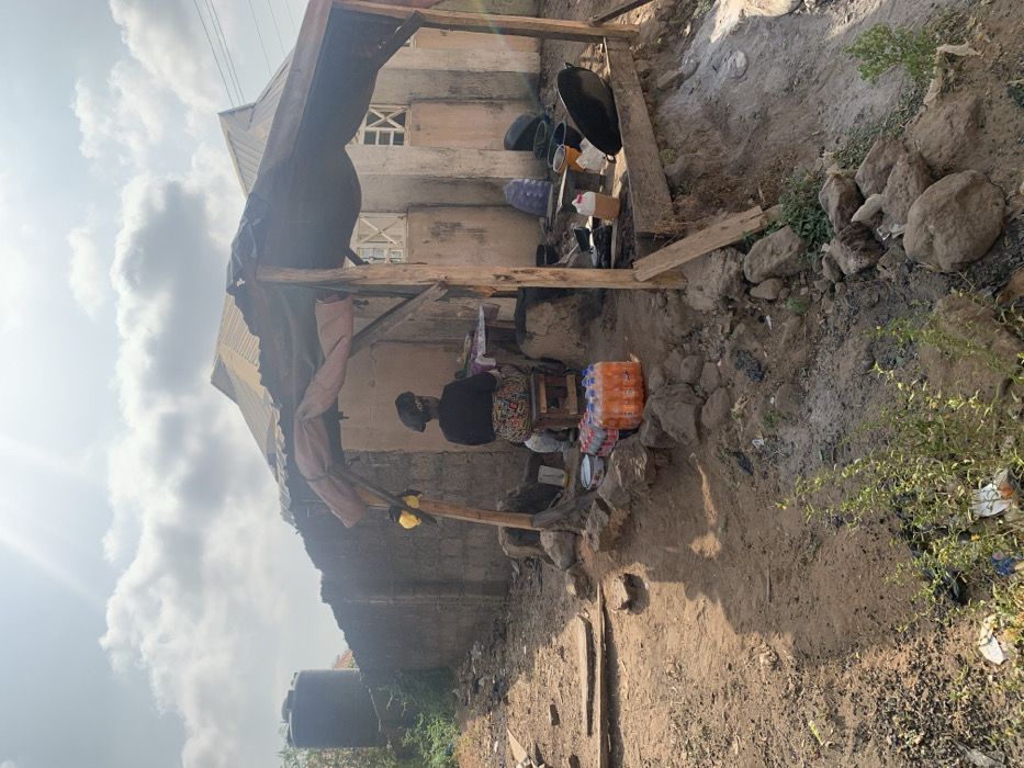 The image displays an outdoor scene in Lokoja, Nigeria, under a bright, partly cloudy sky. The central subject is a makeshift commercial stall, constructed with wooden poles supporting a corrugated metal roof partially covered by a light-colored fabric. An adult individual, viewed from the back, is seated on a low wooden stool within the stall, wearing a dark top, a patterned skirt, and a dark head covering. This individual is positioned facing inward towards a low surface. Inside the stall, to the left of the seated person, are several plastic bottles containing an orange liquid, stacked near metal containers. To the right, on a raised platform made of earth and wood, are various cooking implements, including multiple large black pans, a clear plastic bottle of oil, and several dark sacks. The ground around and within the stall is unpaved dirt, scattered with rocks and general debris. The stall is backed by a light-colored building featuring multiple rectangular window openings on the right. To the left, a tall, grey concrete block wall extends into the background. Behind this wall, a large black plastic water tank on a stand is partially visible amidst green vegetation.