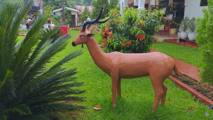 A forensic description of the scene in Kondeni, Tanzania: The image captures an outdoor landscaped area, likely a garden, under diffused lighting. The primary subject is a brown, stylized statue of an antelope, approximately life-size, positioned on wet, vibrant green grass slightly right of the frame's center. The statue possesses black, ridged horns and white markings around its eyes. To the immediate left, a large, dark green sago palm (or similar cycad) occupies a significant portion of the foreground, its fronds displaying visible water droplets. In the mid-ground, a dense bush with bright orange-red flowers and green foliage is situated behind the antelope statue. A reddish-brown paved pathway or border runs horizontally across the scene, separating the grass from additional landscaping elements and a building in the background. The background features a white building with arched architectural elements on the right, adorned with multiple potted plants in white containers. To the left of this structure, another smaller, light-colored building with a sloped roof is partially visible. Further back, various trees and green vegetation form a dense backdrop. A single brown leaf rests on the wet grass near the antelope's front legs. No human subjects are present in the frame.