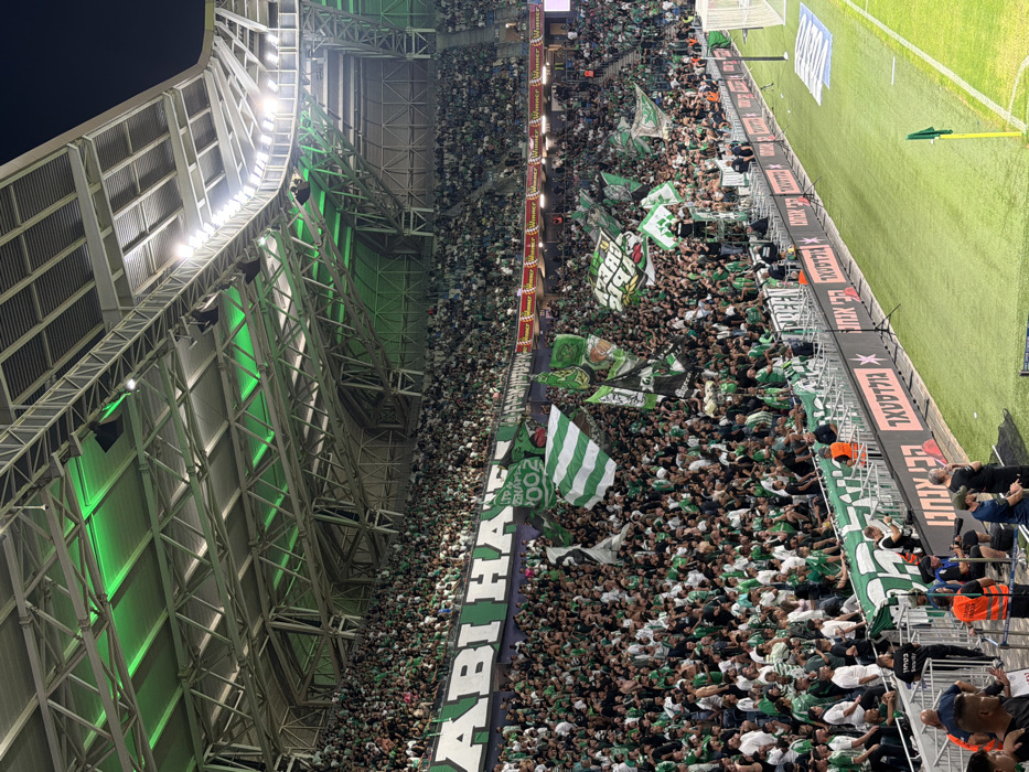 This image depicts a wide view of a packed football stadium at night. The scene is identified as Sammy Ofer Stadium in Haifa, Israel, based on the prevalence of green and white colors associated with Maccabi Haifa, and visible Hebrew text on banners and pitch-side advertising boards. Thousands of spectators, predominantly male, occupy the multi-tiered seating sections, with the vast majority wearing green and white clothing. Numerous large green and white flags, including some with horizontal stripes and club crests, are being actively waved throughout the crowd. A prominent banner above the crowd partially reads "MACCABI HA..." (indicating Maccabi Haifa). The stadium's modern, exposed metal truss roof structure is visible overhead, illuminated by bright lights, some casting a distinct green glow onto the ceiling. In the foreground, a section of the meticulously maintained green football pitch is visible, complete with white boundary lines and a green corner flag on a yellow pole. A partial view of a white goal post structure is seen on the right. Lining the perimeter of the pitch are digital or illuminated advertising hoardings displaying Hebrew text and sponsor logos, including "Winner" and "Goldstar". Several individuals identified as stadium staff or security personnel, wearing orange high-visibility vests, are positioned near the pitch-side barriers. Photographers with professional cameras mounted on tripods are also present along the pitch perimeter.