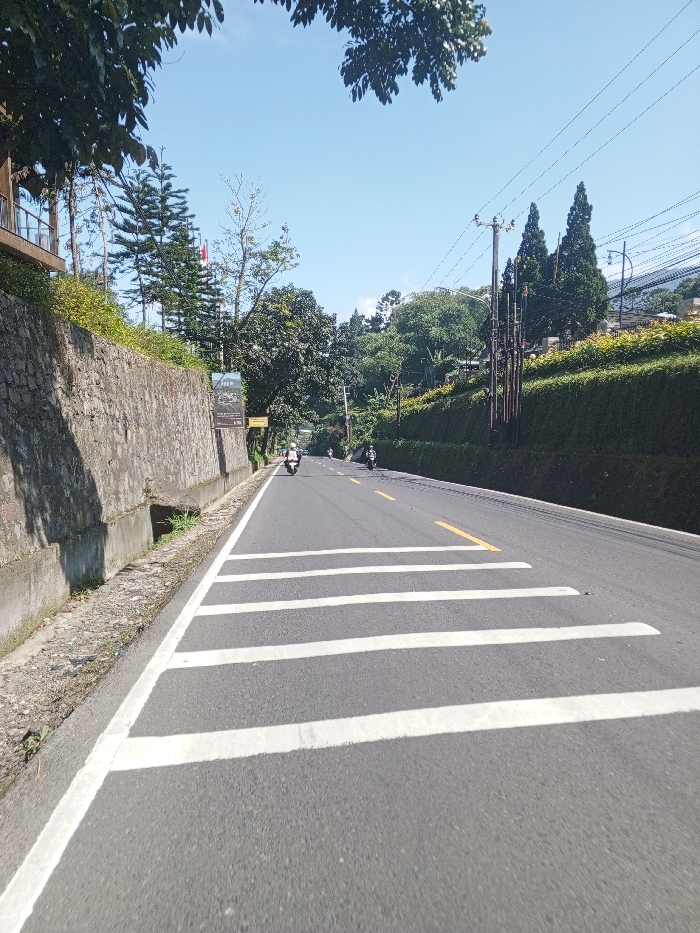 A daylight scene in Multhan, India, depicts an ascending asphalt road under a clear blue sky. In the foreground, four thick white horizontal dashed lines mark a pedestrian crossing, bordered on the left by a solid white line. Adjacent to the left edge of the road, a concrete drainage channel runs alongside a rough stone retaining wall. Above this wall, dense green foliage, several trees including conifers, and part of a light-colored building structure with balconies are visible. A large, dark rectangular sign with light text is mounted on the retaining wall. On the right side of the road, a steep embankment is covered with uniformly trimmed green hedging. Multiple utility poles with a dense network of overhead power lines are positioned along this embankment. Further up the road, trees and scattered structures populate the hillside. The road itself exhibits yellow broken center lines beyond the foreground markings. At least three motorcycles are observed in the mid-ground, traveling away from the viewer up the incline. One motorcycle rider wears a white helmet. The overall environment is green and appears hilly.