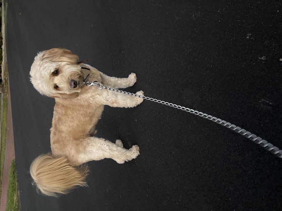 A light tan Goldendoodle dog sits on a black asphalt surface, facing the camera. The dog has curly, fluffy fur and is wearing a brown collar with a silver leash attached. A small patch of green grass is visible in the lower left corner of the image. The leash extends diagonally across the asphalt.