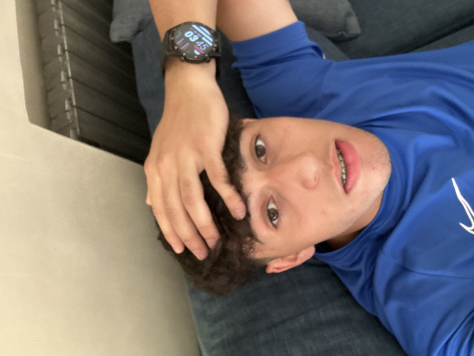A young male is depicted in an indoor, eye-level, selfie-style photograph. He has medium skin tone, dark curly hair, and brown eyes, with visible dental braces on his upper teeth. The subject wears a blue short-sleeved t-shirt with a white Nike swoosh logo on the chest. His left hand is positioned on top of his head, and a black digital smartwatch is visible on his left wrist, displaying the time "03:45". He maintains direct eye contact with the camera. The background features a dark blue or grey upholstered surface, suggesting a sofa or bed, upon which the subject appears to be reclining. Behind him, a plain light-colored wall is visible, with a dark, horizontal slatted structure, possibly a radiator or vent, in the upper right quadrant of the image. The specific location within the city of Sarouja Municipality, Syria, is not visually discernible from the image.