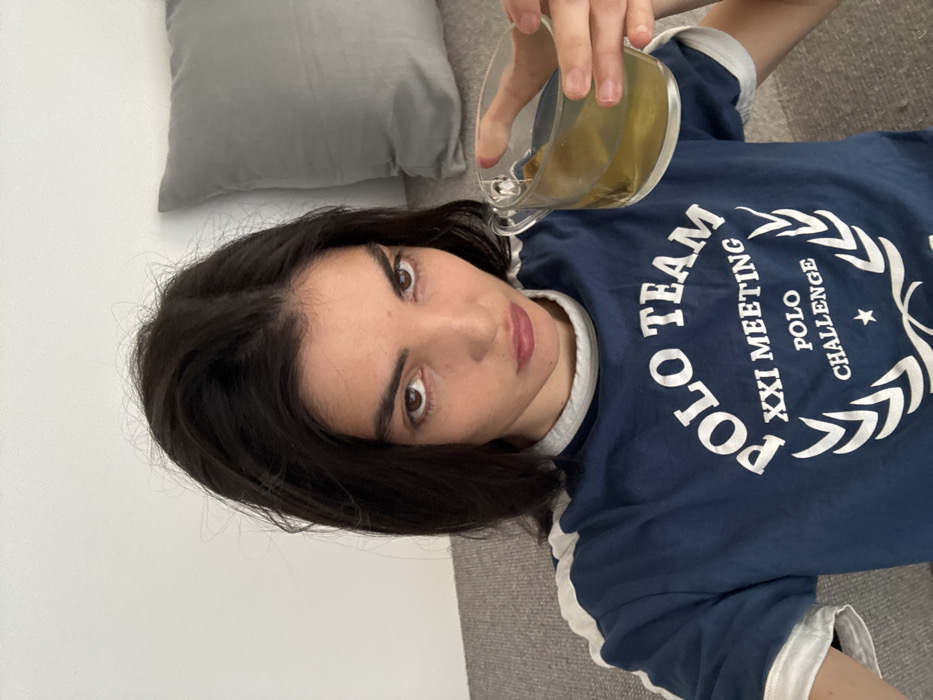 The image depicts a single female individual in an indoor setting within the city of Barcelona, Spain. The subject, possessing dark hair, brown eyes, and fair skin, gazes directly forward with a neutral to slightly firm expression. She is wearing a navy blue short-sleeved t-shirt with white trim on the collar and sleeves. The shirt's front features a white circular design, including the text "POLO TEAM XXI MEETING POLO CHALLENGE" encircling a laurel wreath logo. Her right hand holds a clear glass mug containing a yellowish-green liquid, consistent with tea, which includes submerged plant material. The background consists of a plain light-colored wall, and a grey upholstered surface, likely a sofa or bed, upon which a grey pillow rests to the right of the subject.