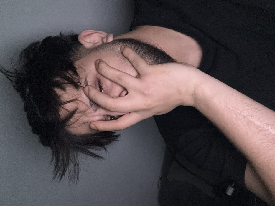 A person with dark hair and a beard covers their face with their hand, obscuring their eyes. A tear is visible. They wear a black shirt. The background is a muted gray. The image is slightly tilted, with the person appearing to be angled toward the right side of the frame. A scar is visible on the forearm.