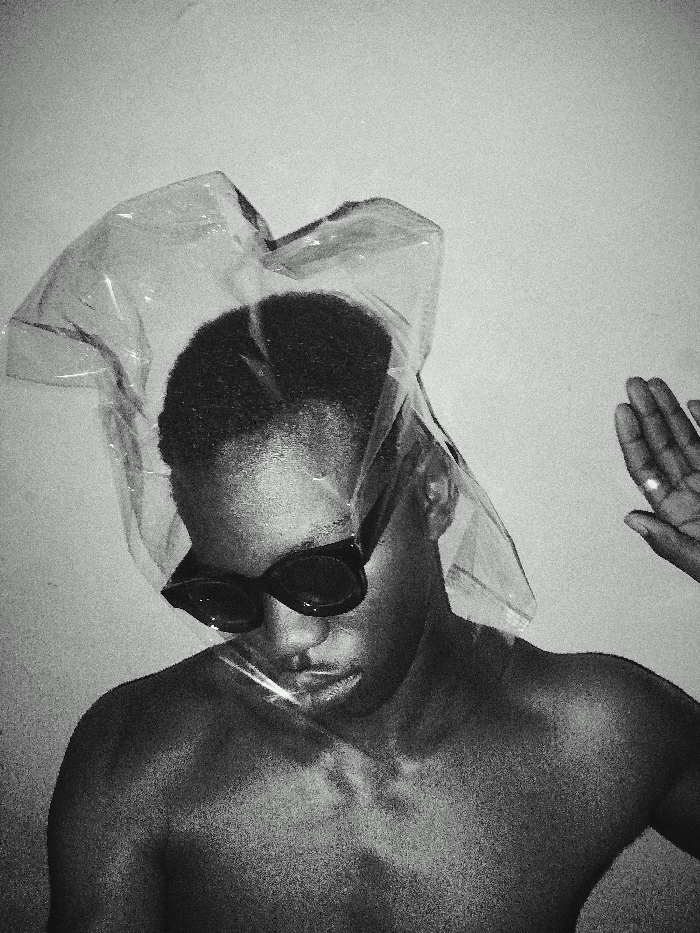 A black and white photograph depicts an individual in Sabon Tasha, Nigeria. The subject, identifiable as male, is captured from the chest up against a plain, light-textured background. His head is partially covered by a transparent, crinkled plastic bag or sheet. Dark, cat-eye style sunglasses obscure his eyes, and his gaze is directed downwards. His upper torso is bare, revealing shoulders and chest. The individual's left hand is raised towards the upper right, palm facing outwards with fingers slightly splayed. A small, bright, circular reflection or object is visible on the palm. The image exhibits a grainy texture.