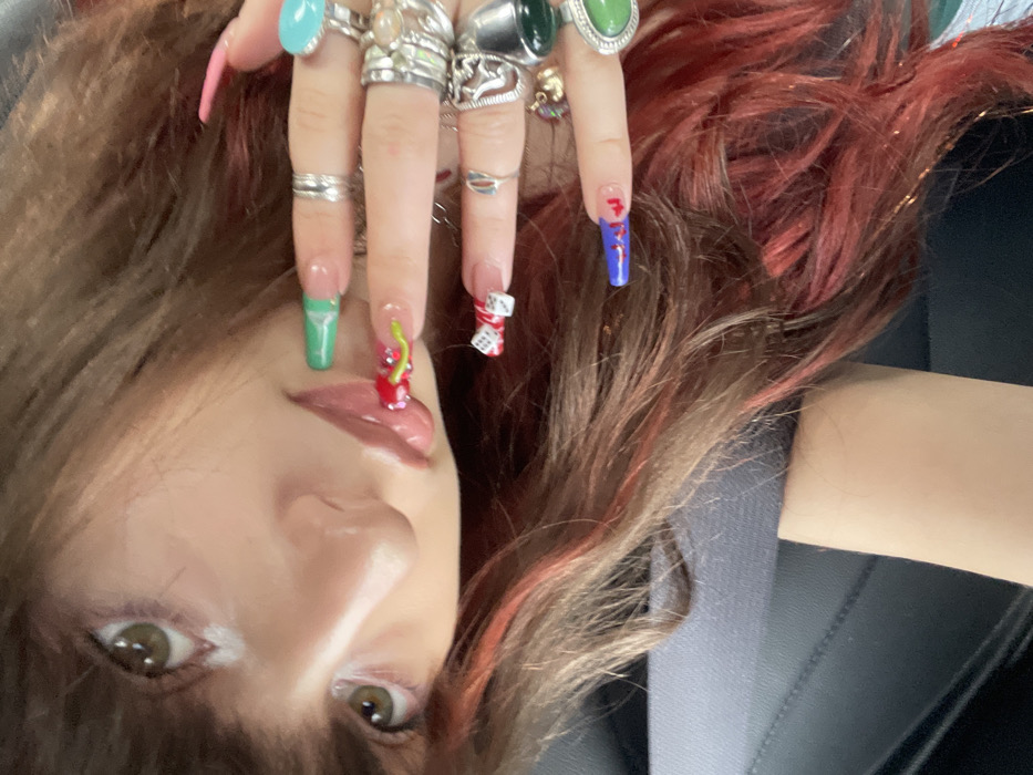 A selfie captures a person with colorful, highly adorned nails and numerous rings. The nails feature various designs, including dice and a cherry. The rings are primarily silver with large stones. The person has brown hair with red highlights and brown eyes. The image is taken from an unusual angle, showcasing their face and hand against a backdrop of car interior elements.
