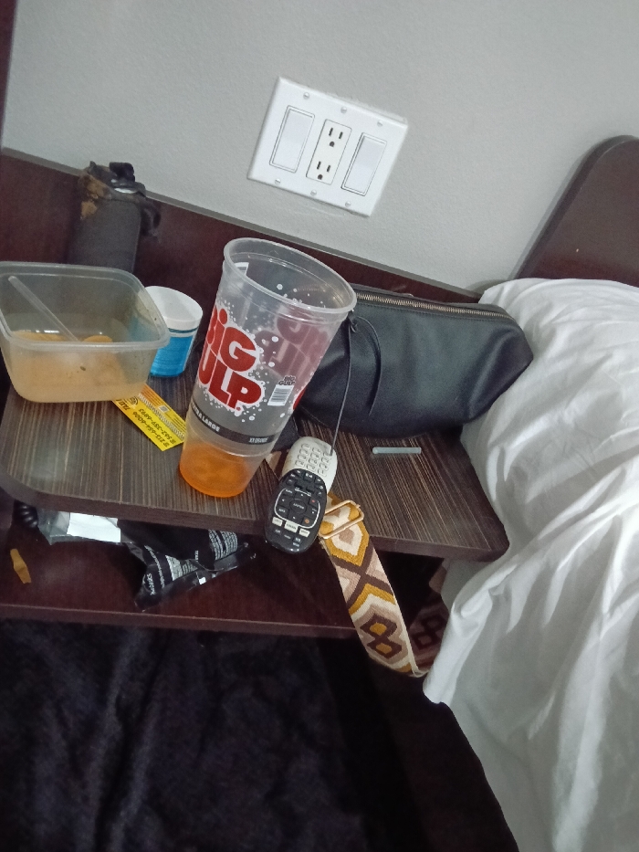 This image depicts a cluttered bedside table in a room located in Monterey Park, United States of America. No individuals are present in the scene. On the table's brown, striped laminate surface, a clear plastic "Big Gulp" cup, labeled "Extra Large" with 7-Eleven branding, stands upright containing a small amount of amber-colored liquid residue. To the left of the cup, a rectangular clear plastic food container with a lid holds light-colored food or liquid residue and a plastic spoon. Adjacent to this container, a small blue and white plastic cup or container is visible. Beneath the "Big Gulp" cup, a yellow paper, possibly a receipt or label, displays partial text including a phone number beginning "909-773-". A black zippered fanny pack rests to the right of the cup, partially on the table. Further to the right, a white cordless telephone handset with a black keypad and display lies on the table. A thin, grey cable extends from the phone towards the fanny pack. Below the phone, a fabric strap with a geometric pattern in brown, tan, and white hangs over the edge of the table. A small, opaque white stick-like object is visible on the table surface near the phone. The background shows a light grey wall featuring a white electrical faceplate mounted above the table, which contains two rectangular light switches and a central duplex electrical outlet. To the far right, a portion of a dark brown headboard is visible next to a white pillow covered by a white sheet, indicating a bed. A dark-colored blanket or bedding is visible in the lower portion of the frame, underneath the table. A dark water bottle or thermos is partially visible behind the items on the far left of the table. A crumpled black wrapper is located on a lower shelf beneath the main table surface.