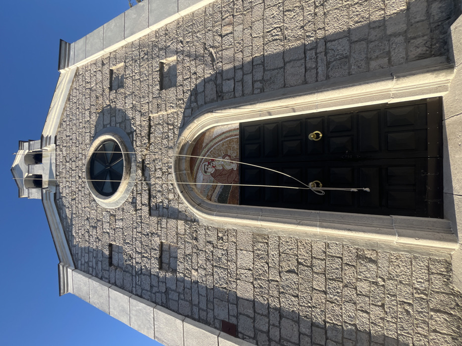 The image depicts the front facade of the Church of St. Anthony of Padua, located in Cetinje, Montenegro. The building features a symmetrical design constructed from light-colored, rough-hewn stone blocks, interspersed with smoother, lighter-toned stone for framing and structural accents. At the base, a dark, double-leaf wooden door serves as the entrance. Each door leaf is adorned with a prominent gold-colored lion's head knocker. Immediately above the arched doorway, an ornate mosaic is set into the recess, portraying a robed figure, presumably a saint, holding an infant and a white lily. Above the mosaic and centered on the facade, a circular window with a star-shaped spoke pattern is framed by smooth, light stone. The uppermost section of the facade culminates in a small, open bell tower (campanile) featuring two arched openings, each containing a bell, and topped with a triangular pediment. A single white rope hangs vertically down the center of the facade, extending from the upper portion, passing over the circular window and the mosaic, and ending with a coiled knot near the top of the entrance doors. The sky above is clear and bright blue, indicating a sunny day. Direct sunlight illuminates the facade, casting distinct shadows on architectural elements, particularly on the right side. No individuals or other objects are visible in the immediate foreground or sides of the structure.