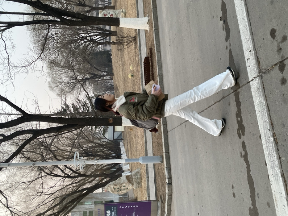 This image depicts an outdoor pedestrian scene in the city of Linghe, China. A single individual, appearing female, is captured in mid-stride, walking from the left to the right across a grey asphalt surface marked with white lines and cracks. She has dark hair, wears a white scarf, an olive green bomber jacket with a red patch on the left chest, white wide-leg pants, and black and white athletic shoes. She carries a grey backpack with a dark red accessory attached, and holds a light brown paper bag and a light-colored mobile phone in her right hand. To the left of the frame, a grey light pole with a white upper section stands beside a partially visible purple sign with white Chinese characters. Further left and behind the pole is a large, irregularly shaped light-colored rock with Chinese inscriptions. The background features numerous deciduous trees with bare branches, interspersed with a few evergreen trees, indicating a winter or early spring season. The ground beyond the asphalt is covered with dry, brown grass. Several tree trunks in the mid-ground are painted white at their bases. Another large rock with Chinese inscriptions is visible further to the right in the background. A low, brown, textured barrier runs along the grassy area on the right. Distant buildings are faintly discernible through the trees. The sky is overcast.
