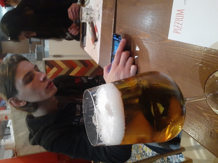 A person with long brown hair is seated at a wooden table with a large glass of beer
