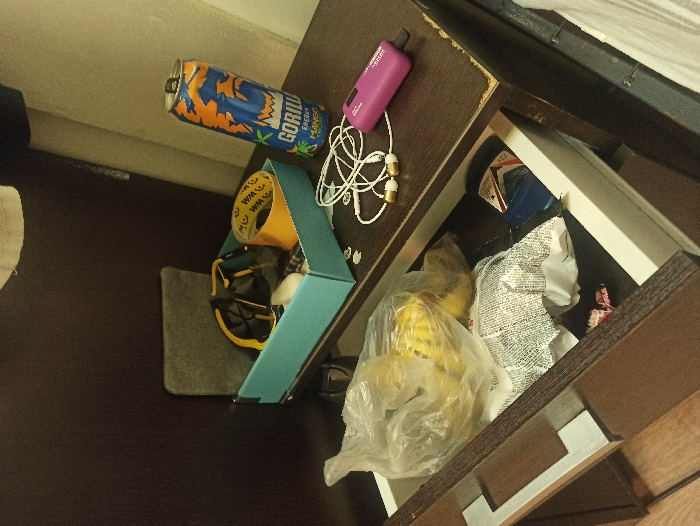 The image depicts a cluttered interior scene within what appears to be a temporary living space at the Tecnimont camp, Russia. The primary focus is a dark brown wooden drawer unit or nightstand, with one drawer partially open in the foreground. On the top surface of the unit, from left to right, are: 1. A light blue open box containing assorted items, including a pair of black and yellow safety glasses/goggles, a roll of yellow adhesive tape marked with "WM" logos, and other indistinct small objects. 2. An empty, crumpled blue and orange "Gorilla Energy Drink Mango" can. 3. A tangled set of white wired earphones with gold-colored earbuds. 4. A small, purple electronic device, possibly an MP3 player, with faint white lettering on its side. The open drawer, which has a white interior and a dark brown exterior with a silver-colored handle, contains: 1. A clear plastic bag holding several yellow fruits, likely bananas or similar. 2. A crumpled white plastic bag or packaging with black text or patterns. 3. A partially visible blue object, possibly a container, located at the back right of the drawer. The background shows a dark brown wall or furniture piece on the left, transitioning to a lighter-colored wall on the right. A section of white fabric, possibly a towel or clothing, hangs from above, partially visible at the top edge of the frame. Part of a bed or mattress with white bedding is visible on the far right. The floor in the lower-left foreground is dark wood. No individuals are present in the scene, and no specific actions or interactions are depicted.
