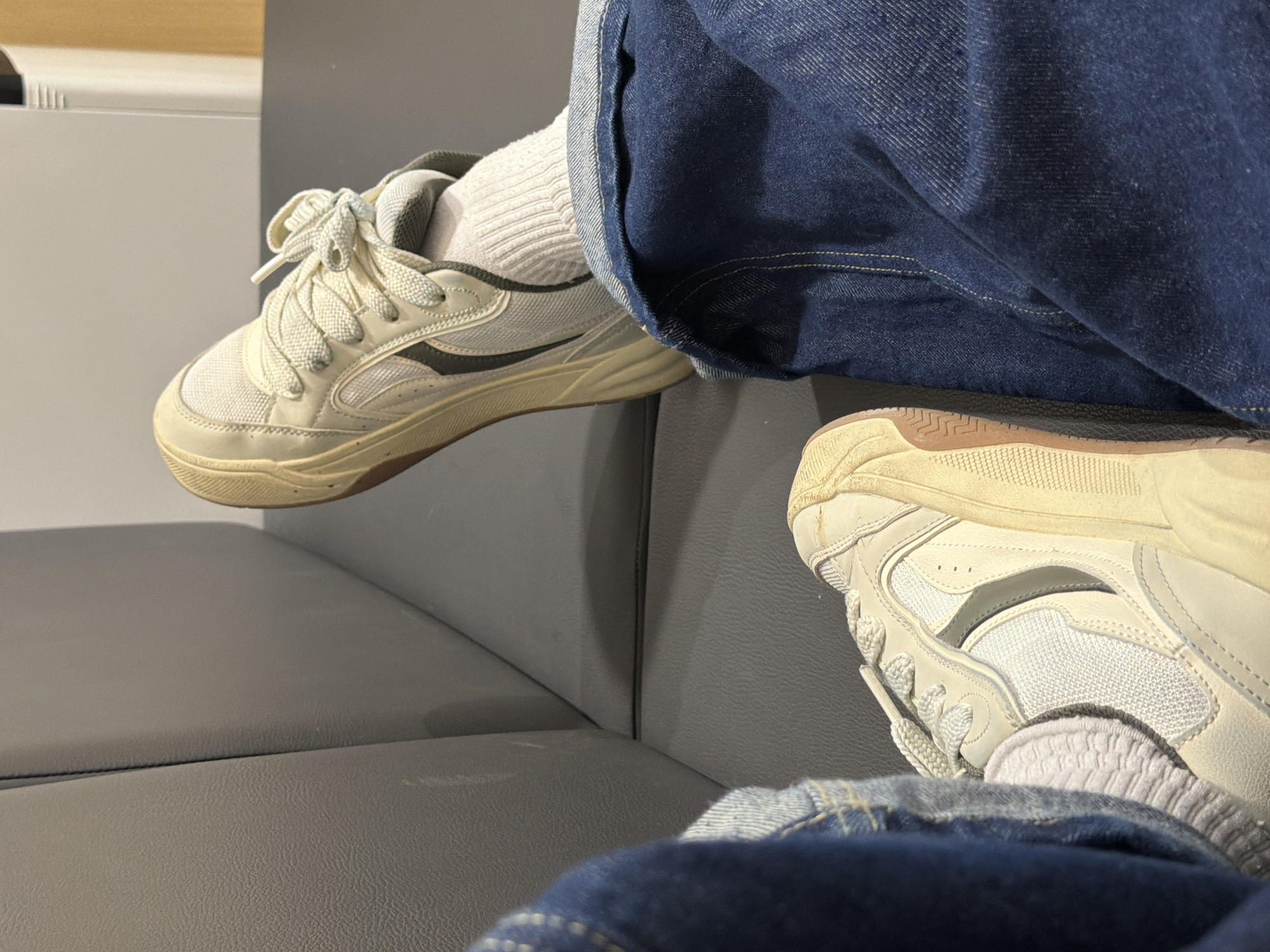 The image provides a close-up, low-angle view of a person's lower legs and feet within an indoor setting in Sofia, Bulgaria. The individual wears dark blue denim jeans with visible yellow contrast stitching, paired with light grey crew socks. Both feet are clad in off-white athletic shoes, characterized by thick, discolored cream-yellow soles and dark grey side accents on the upper portions; the laces are tied. The feet are positioned on a dark grey, textured surface, consistent with upholstered seating, with a matching vertical dark grey panel visible directly behind them. A light-colored wall occupies the upper background, with a partial light brown wooden element discernible in the upper right quadrant.