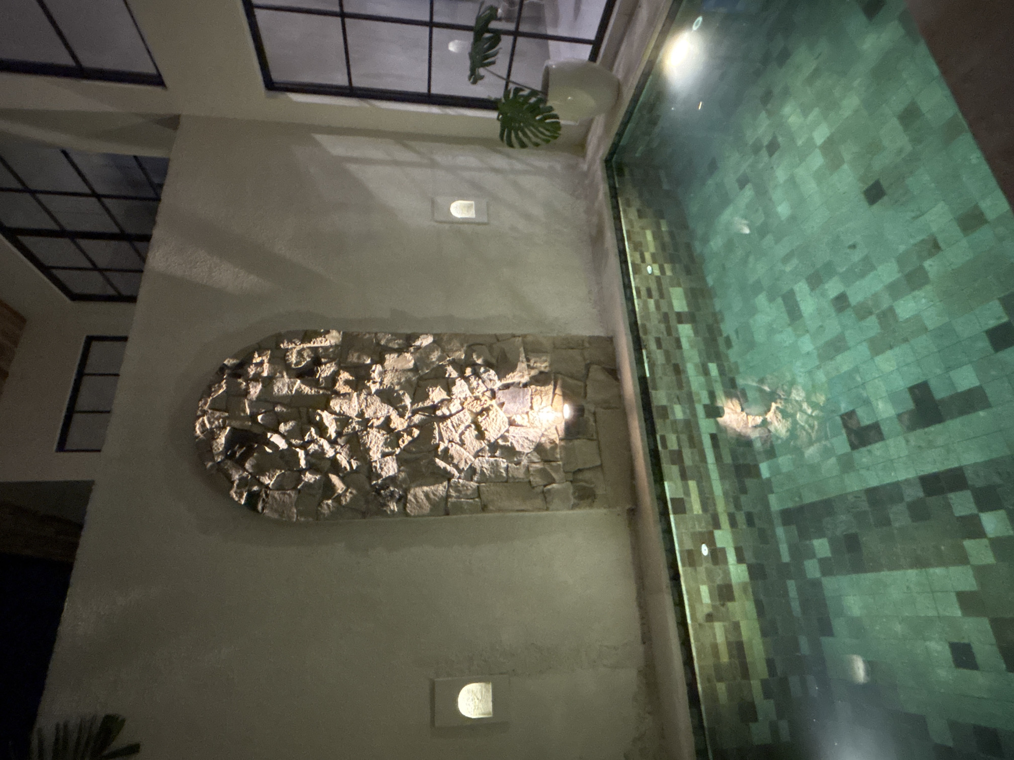 The image depicts an indoor or semi-outdoor swimming pool area at night, located in Kerobokan Kelod, Indonesia. The scene is illuminated by artificial light sources. In the foreground and midground, a rectangular swimming pool occupies a significant portion of the frame. The pool's interior is lined with mosaic tiles, predominantly in shades of green and dark green/black, arranged in a checkerboard pattern. The water surface is still, reflecting the overhead and wall lighting. The pool is bordered by light-colored, possibly off-white, textured walls. Centered along the back wall, above the pool, is a prominent architectural feature: an arched, vertical section constructed from irregularly shaped, light-colored rough-cut stones. This stone feature is illuminated from its base by an unseen uplight, creating shadows and highlights on its textured surface. To the left of the stone feature, a small, arched, recessed wall light emits a soft, upward glow. A similar recessed wall light is present to the right of the stone feature, casting light onto the adjacent wall. In the upper right portion of the image, large, dark-framed windows with multiple panes are visible, indicating an adjacent room or exterior space that is dark. Below these windows, positioned in the corner by the pool, is a potted plant with large, green, possibly Monstera leaves, contained within a white, rounded pot. The upper left portion of the frame shows a continuation of the light-colored wall, with a partial view of what appears to be a dark ceiling or roofline. No people or active interactions are present in the scene. The environment appears clean and well-maintained.