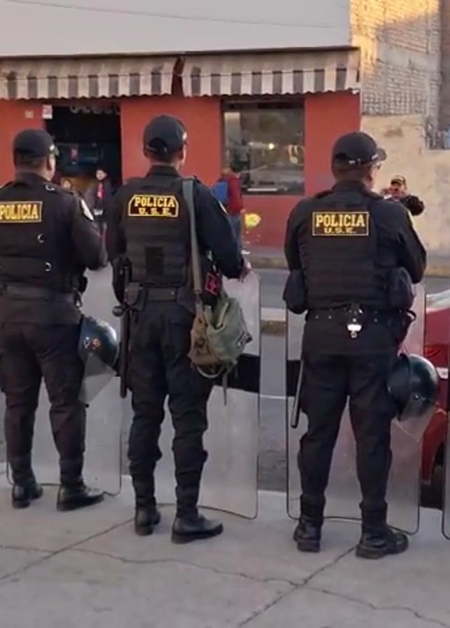 group of at least five police officers, from the back, wearing black uniforms with yellow lettering. The officers are lined up on a sidewalk in front of a building, holding helmets and clear riot shields. Some officers are labeled "POLICIA U.S.E.", while others are labeled "G.I.R AREQUIPA." There are people walking in the background. The building behind the officers has a sign in Spanish that says "ABOGADOS PENAL - CIVIL - FAMILIA", indicating that it is a law office. A red car is parked next to the officers on the right.