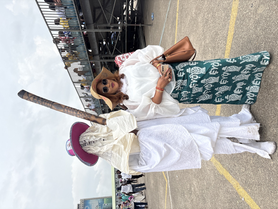 An outdoor scene captures two individuals on a paved surface marked with yellow lines, likely Tafawa Balewa Square (TBS) on Lagos Island, Lagos, Nigeria. The sky is overcast. On the left, an Eyo masquerade stands erect, completely enveloped in white, flowing fabric robes that obscure the body and face. The masquerade wears a wide-brimmed hat, predominantly pink with a blue-grey rim featuring patterned details. It holds a long, dark brown wooden staff, identified as an Opambata, carved with geometric designs, diagonally upwards. White footwear is visible. On the right, an adult female with reddish-brown hair and dark sunglasses wears a wide-brimmed straw hat with light floral accents. She is dressed in a white sheer long-sleeved blouse with a ruffled white neckline and a long dark green skirt patterned with white "EYO" text and stylized Eyo figures. She holds a gold-cased smartphone in her left hand, which is adorned with red and gold bracelets and rings. A brown leather tote bag hangs from her right shoulder. She looks directly at the camera with a slight smile. In the background, metal bleachers filled with numerous spectators in varied attire are visible. Further left, additional individuals are scattered across the paved area. A modern building with a light blue glass facade is partially visible on the far-left horizon.