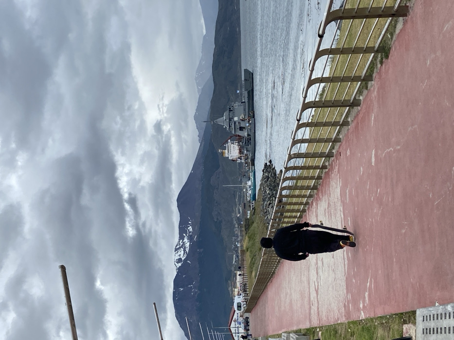 A person skateboards along a red path next to a waterfront. A metal railing separates the path from a grassy area and the water. In the distance, a large ship floats in the water, with mountains rising behind it. The sky is overcast and cloudy, casting a somber tone over the scene.