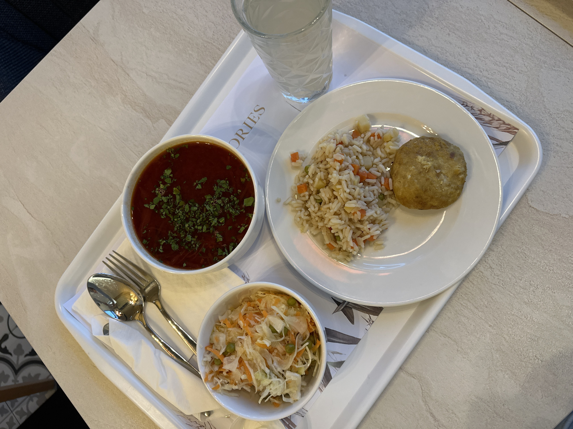 A white cafeteria tray containing a prepared meal is situated on a light-colored, textured tabletop in Polje, Montenegro. The tray holds a partially visible paper placemat featuring a botanical design and the legible text "DRIES." A set of silver cutlery, consisting of a spoon and a fork, rests on a folded white napkin. The meal comprises a white bowl of red soup garnished with green herbs, a smaller white bowl filled with a salad of shredded cabbage, carrots, and peas, and a white plate presenting rice pilaf mixed with diced carrots, peas, and potato pieces, accompanied by a single, fried, golden-brown patty. A clear, patterned glass holds a pale, translucent liquid. The immediate background shows a dark, indistinct object to the upper right and a patterned surface in the upper left.