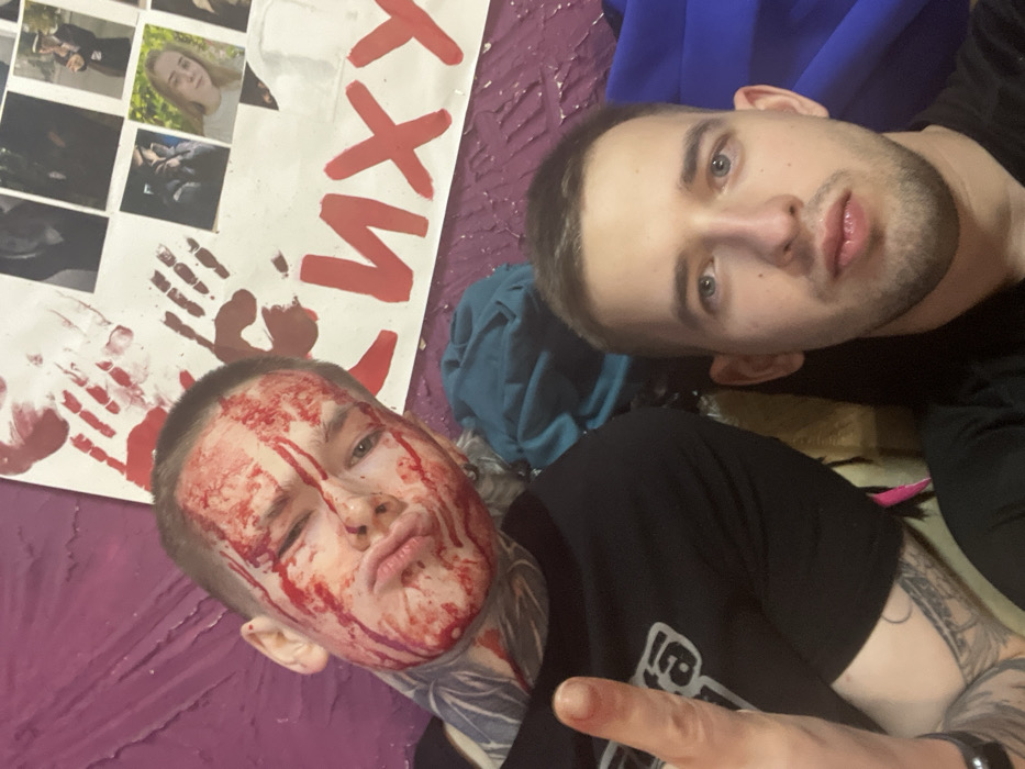 Two young men pose for a selfie. One has a bloody face, appearing injured, but seemingly unharmed, with heavy, red makeup applied. The other man looks directly at the camera with a serious expression. In the background, a collage of photos is visible, along with large red lettering, possibly Cyrillic. Painted red handprints appear on the poster, adding to the disturbing theme of the scene.