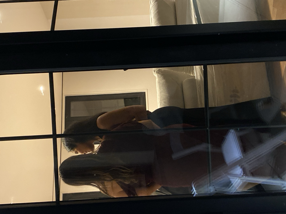 Through a window, a woman with dark hair, wearing a black top and leggings, is seen indoors