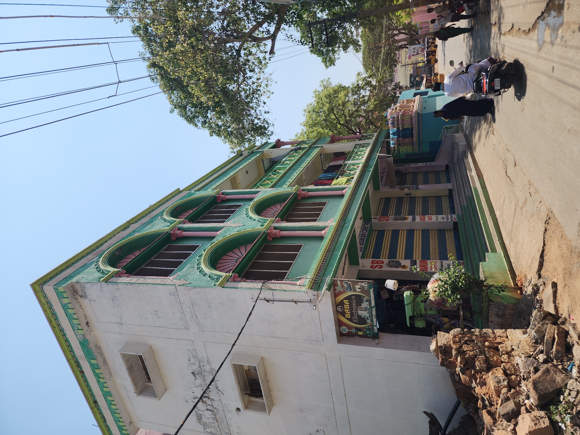 The scene depicts a street view in Pedda Kammavaripalli, India, under a clear blue sky. A multi-story building occupies the left and central portions of the image. The building's left facade is white and weathered, featuring two rectangular window openings and horizontal bands. The front facade is predominantly teal-green with decorative pink arched window frames and pink columns on the upper floors. Balconies with green railings are visible on the second and third stories, with various colored clothes hanging on a clothesline on the second-floor balcony. At ground level, a shop named "BABA Electronics" is visible on the far left, displaying a sign with images of appliances and contact numbers (8498714984, 7893339444). A green drill press is positioned outside this establishment. Adjacent to it are storefronts with blue and white striped roll-down shutters, marked with "SB" logos, and a sign identifying "JD. BANIAN CENTRE" for wholesale and retail. To the immediate left of the building, a pile of concrete and brick rubble rests on the ground. A small green plant grows in a planter near the building's entrance steps. Electrical wiring extends across the white facade of the building and overhead against the sky. A paved road, showing cracks and irregular patches, extends from the foreground into the background, curving slightly to the right. A male individual in a white shirt and white lower garment is operating a black scooter (license plate AP40K M7448) on the road, traveling away from the viewer. A person in a dark garment is walking on the sidewalk near the shops, and other pedestrians are visible further down the street on the right. On the right side of the image, large trees with green foliage are prominent. A light blue structure with colorful spires, possibly a temple, is visible next to the road further down. Overhead electrical wires are strung across the sky on the right. In the distance, several yellow auto-rickshaws and other buildings are discernable.