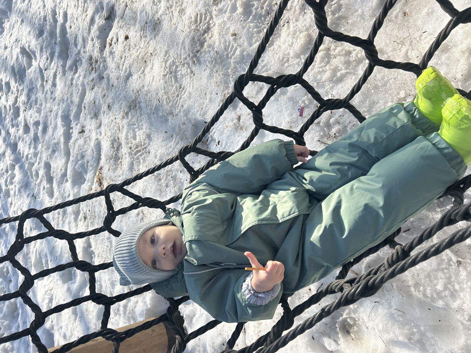 - "A young child, dressed in a sage-green padded snowsuit, a light grey knit beanie with ear-like protrusions, and bright neon yellow winter boots, lies on their back within a large, black rope net swing" by FM-Fc82p1, licensed under CC BY 4.0