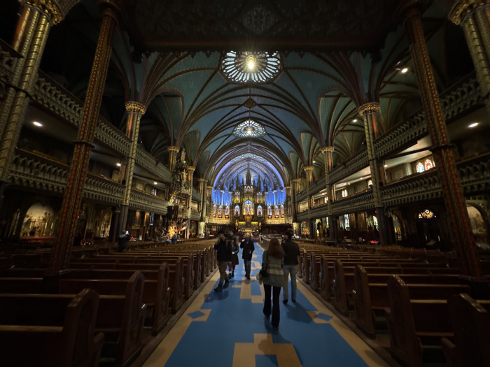 The interior of a grand cathedral is depicted. Rows of wooden pews line a blue central aisle, leading towards a brightly illuminated altar in the distance. Ornate columns and archways, richly detailed with carvings and gold accents, support a high, vaulted ceiling painted in shades of blue. Several people are seen walking along the aisle, adding a sense of scale to the vastness of the space. The overall atmosphere is one of reverence and architectural splendor.