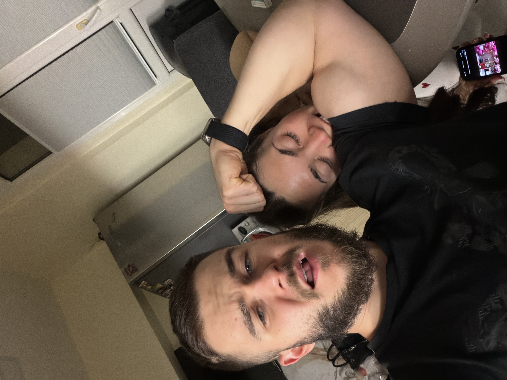 A man and a woman are lying down, possibly on a bed or couch. The woman is lying on her back, with her eyes closed and her arm raised above her head. She is wearing a watch on her wrist and appears to be looking at something on a phone in her hand. The man is lying next to her, looking at the camera with an open mouth. The background shows a wall, a window with blinds, and what appears to be a kitchen cabinet. The location is in Pernik, Bulgaria.