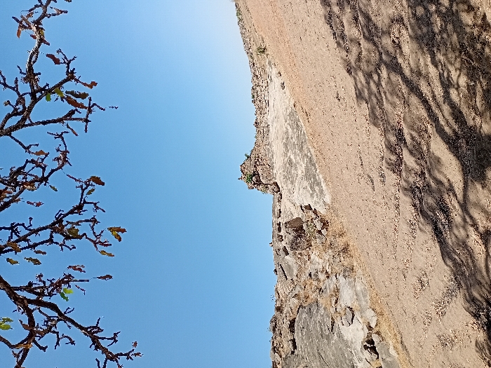 The scene depicts a sunny, arid, and hilly landscape in Nata-Ala, Nigeria. The upper frame reveals bare tree branches with sparse, dried leaves positioned against a clear, light blue sky. The foreground and mid-ground are characterized by an uneven terrain. On the right, a steep, reddish-brown earthen slope displays multiple parallel horizontal striations, suggestive of terracing or erosion patterns. Dark, elongated shadows are cast diagonally across this slope. The left side features prominent greyish-brown rock formations interspersed with patches of dry vegetation. A rocky ridge crests the distant horizon, meeting the clear sky. No individuals, animals, or man-made structures are visible within the frame.