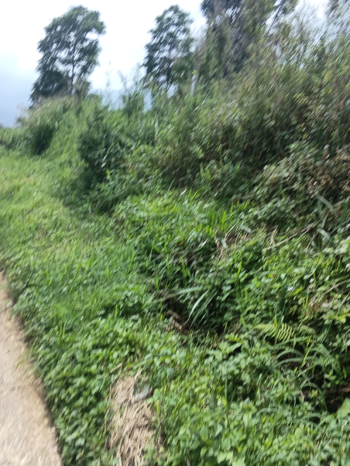Lush, green vegetation dominates the scene, blurring with motion. A narrow, light-colored path lines the left edge. Taller grasses and dense shrubs ascend, obscuring the background. Distant trees stand silhouetted against a muted sky. The overall impression is one of untamed nature captured mid-movement.